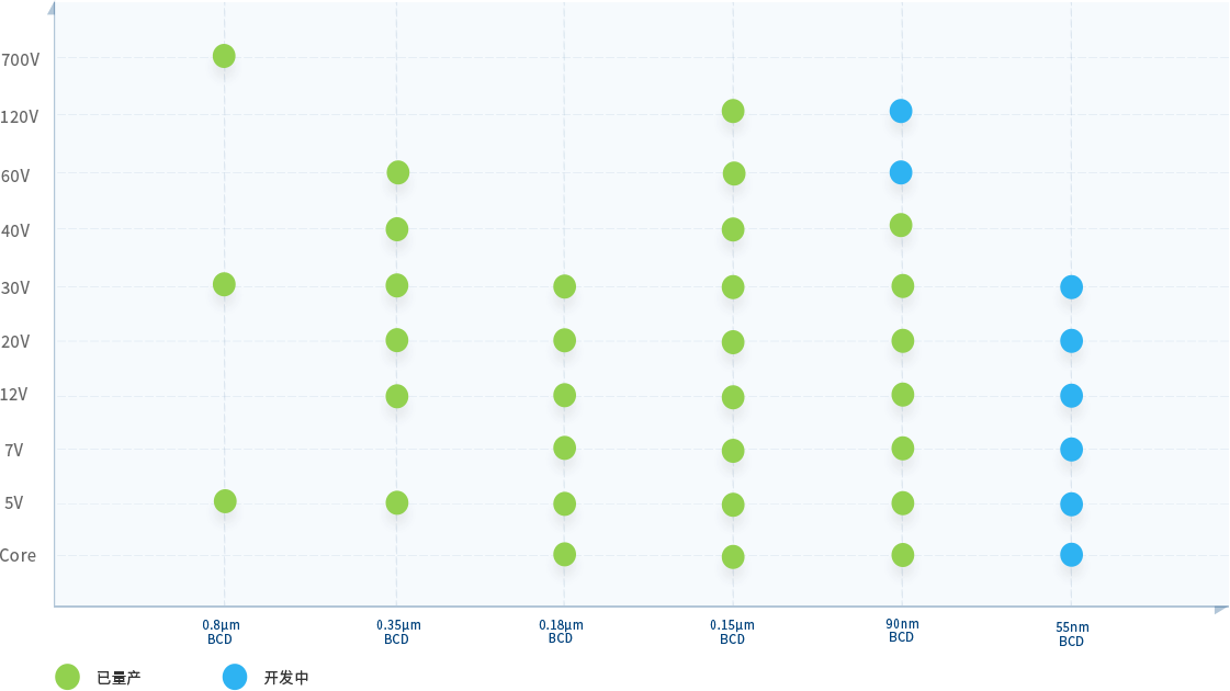 顺发配资BCD(Bipolar-CMOS-DMOS)技术基于先进的CMOS工艺平台,开发出各种电压的高性能,低导通电阻LDMOS,以优越的性能和较低的成本满足各类客户的需求。现在0.15μm 5~40V EPI BCD 、0.18μm 5~30V BCD及 0.8μm 700V BCD已实现大规模量产;90nm 40V BCD, 以及 0.15um 60V 和 120V BCD已开始试产。将持续往更优性能,更高电压,更先进节点开展。